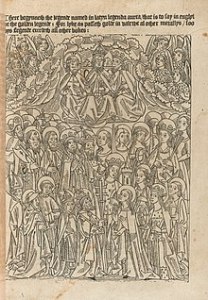 Saint Margaret attracts the attention of the Roman prefect, by Jean Fouquet from an illuminated manuscriptInitially entitled Legenda sanctorum (Readings of the Saints), it gained its popularity under the title by which it is best known. It overtook and eclipsed earlier compilations of abridged legendaria, the Abbreviatio in gestis et miraculis sanctorum attributed to the Dominican chronicler Jean de Mailly and the Epilogus in gestis sanctorum of the Dominican preacher Bartholomew of Trent. When printing was invented in the 1450s, editions appeared quickly, not only in Latin, but also in almost every major European language.[4] Among incunabula, printed before 1501, Legenda aurea was printed in more editions than the Bible[5] and was one of the most widely published books of the Middle Ages.[6] During the height of its popularity the book was so well known that the term “Golden Legend” was sometimes used generally to refer to any collection of stories about the saints.[7] It was one of the first books William Caxton printed in the English language; Caxton’s version appeared in 1483 and his translation was reprinted, reaching a ninth edition in 1527.[8]