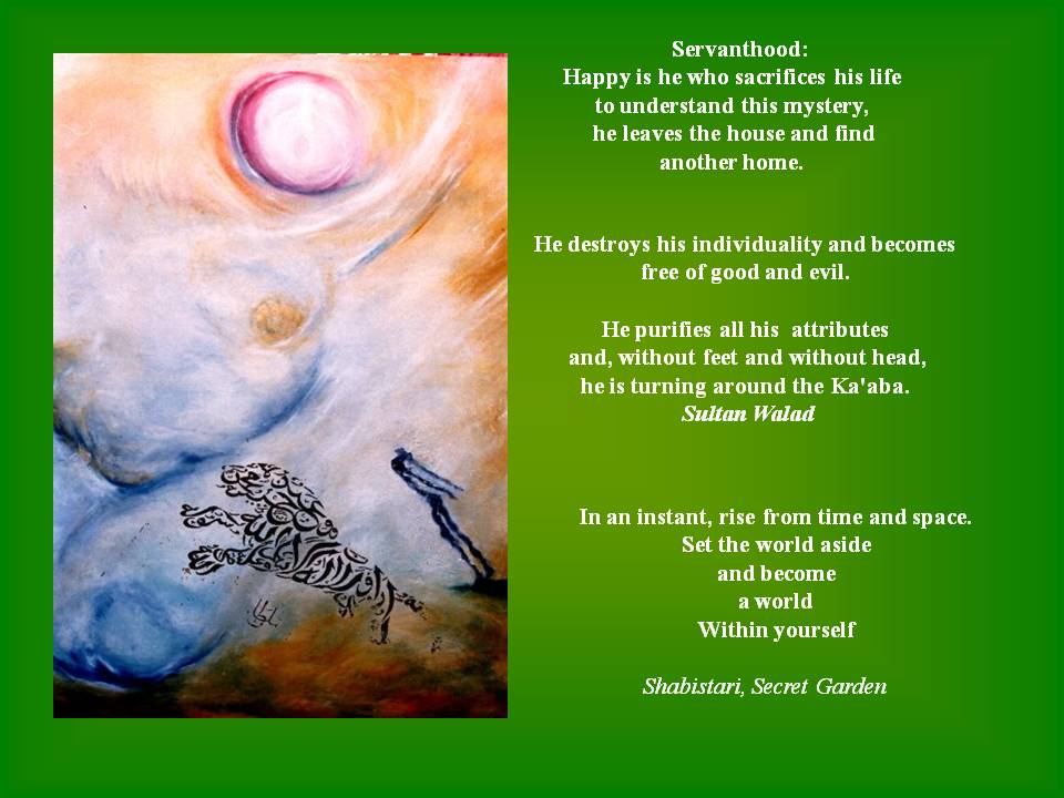 “God’s call, whether veiled or not, grants what he gave to Maryam. 0 you who are corrupted by death inside your body, return from nonexistence to the Voice of the Friend! In truth, this Voice comes from God, although it comes from the servant of God! God said to the saint: “I am your tongue and your eyes, I am your senses, I am your contentment and your wrath. Go, for you are the one of whom God said: ‘By Me he hears and by Me he sees!’ You are the divine Consciousness, how should it be said that you have this divine Consciousness? Since you have become, by your wondering, ‘He who belongs to God’.