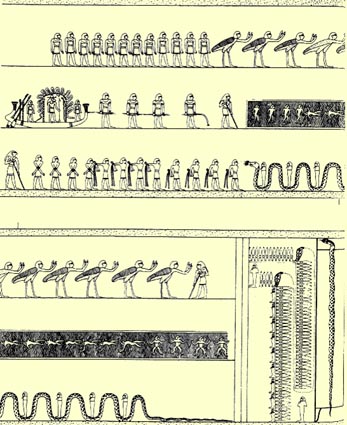 Consciousness moves from Gate to Gate. In Ancient Egypt, life and consciousness were synonymous. To be dead meant to be un-awakened and inert, moved like a leaf in the wind. To be dead, meant to be in a state of consciousness preceding consciousness or “life”. In the section of the Ninth Hour, a crisis menaces the Solar Barque as it passes through the hours of the night. A double monster, half snake half crocodile, SHES-SHES, approaches the boat