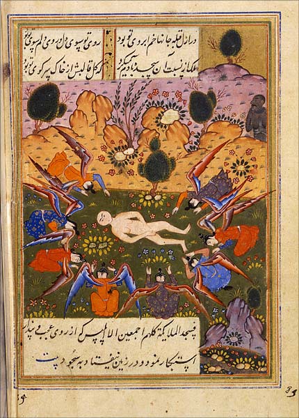 Iblis (top right on the picture) refuses to prostrate before the newly created Adam from a Persian miniature